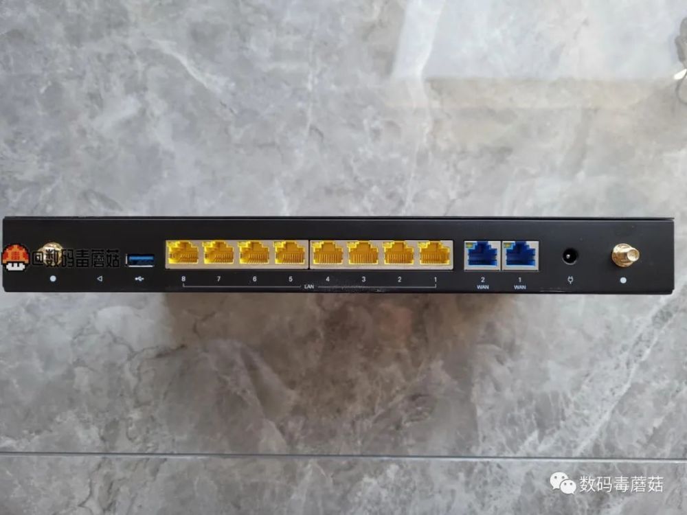 背面一览,双wan + 八lan,带一个usb3.0接口。
